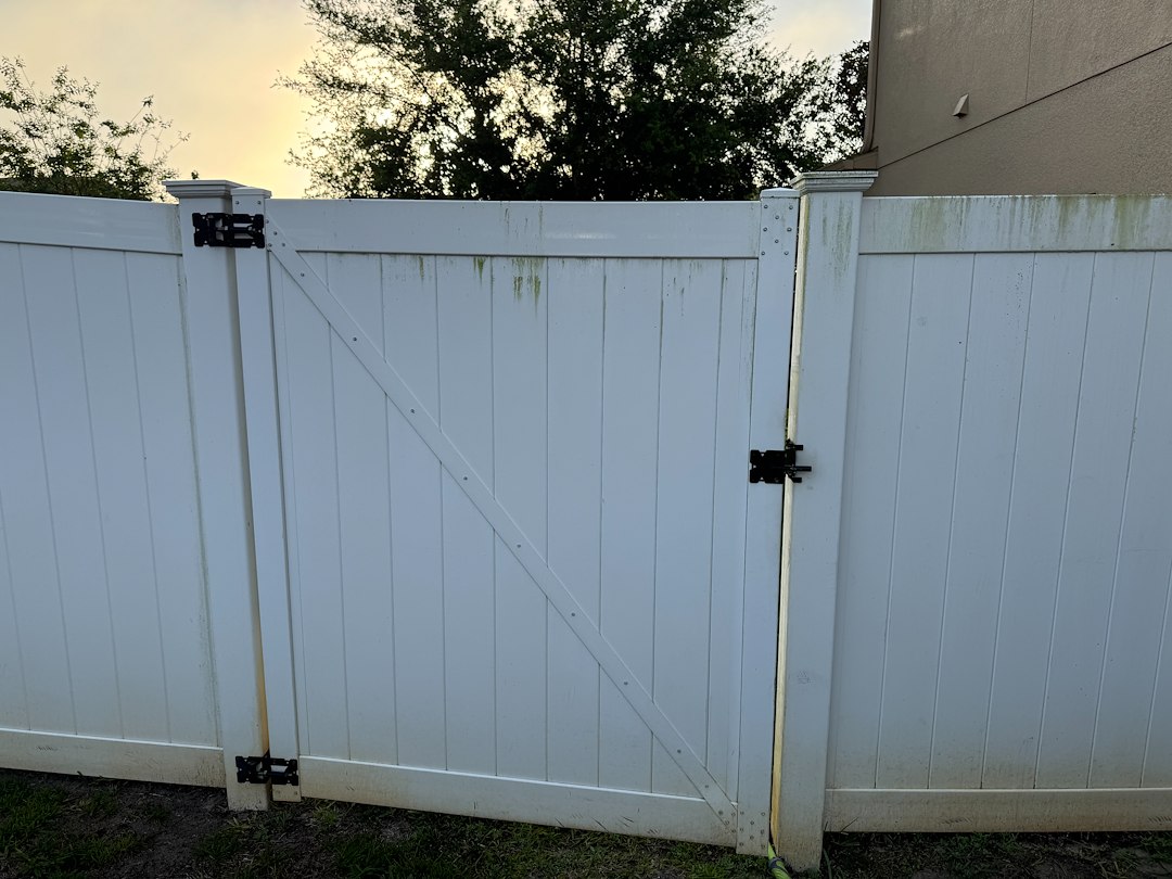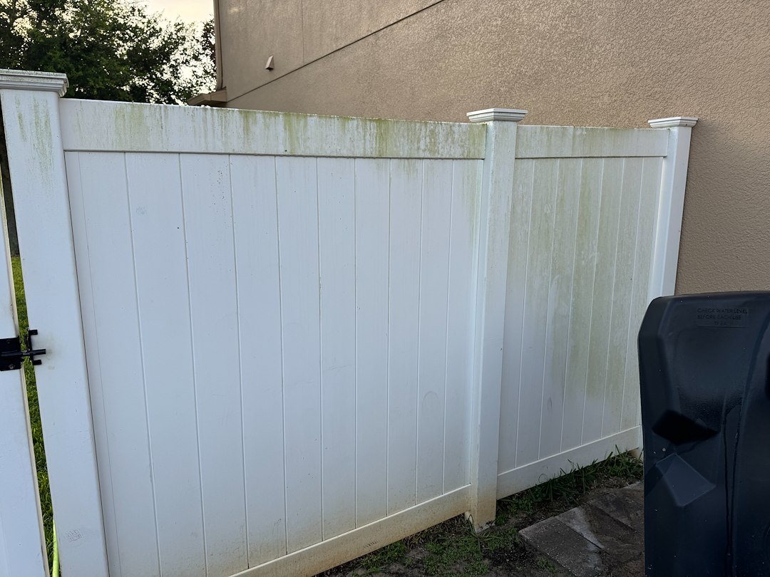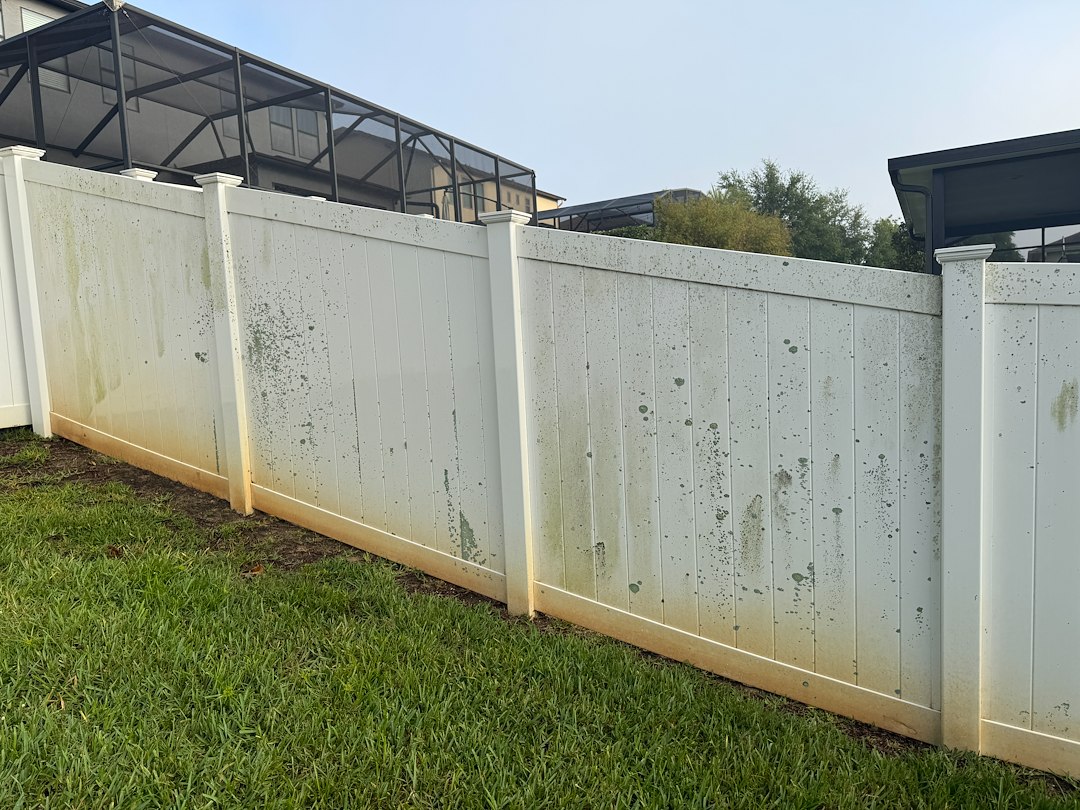 We recently completed a vinyl fence cleaning in the Hunters Run community, where the fence had developed heavy algae, mildew, rust staining from irrigation, and lichen buildup. Like many homes in Central Florida, these conditions had caused the fence to look significantly aged—even though the structure itself was still in great shape.
